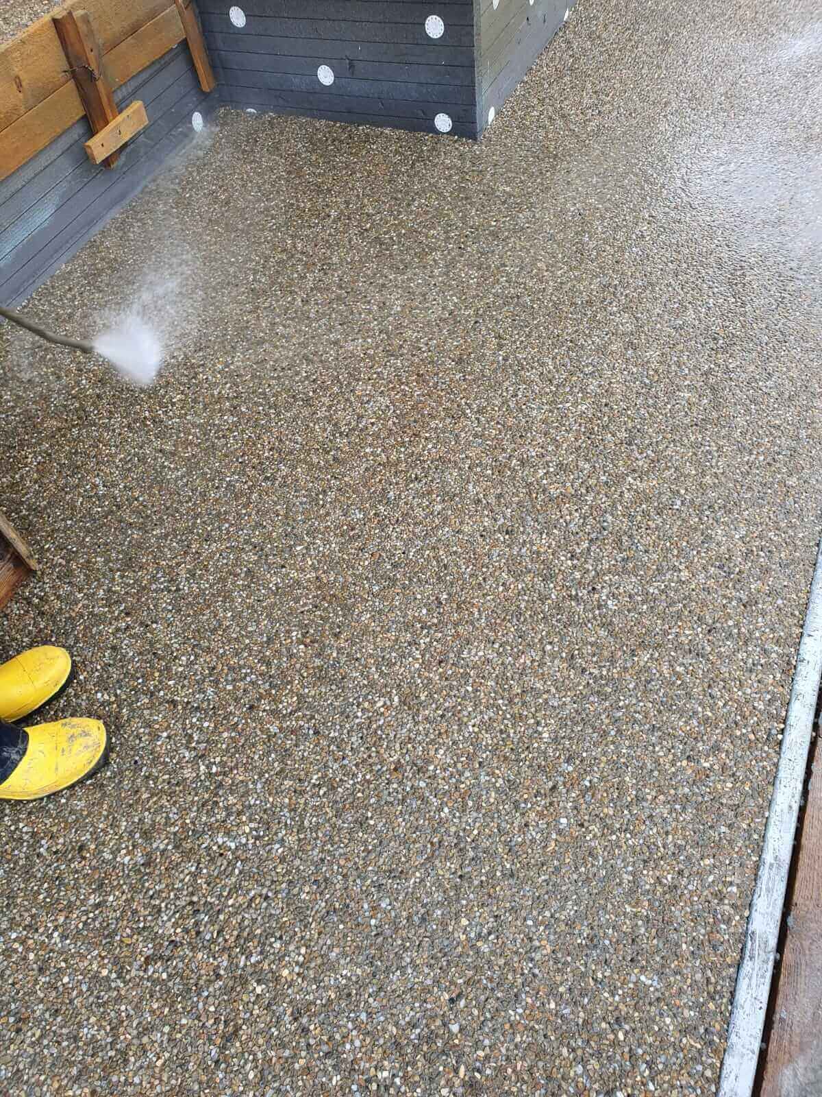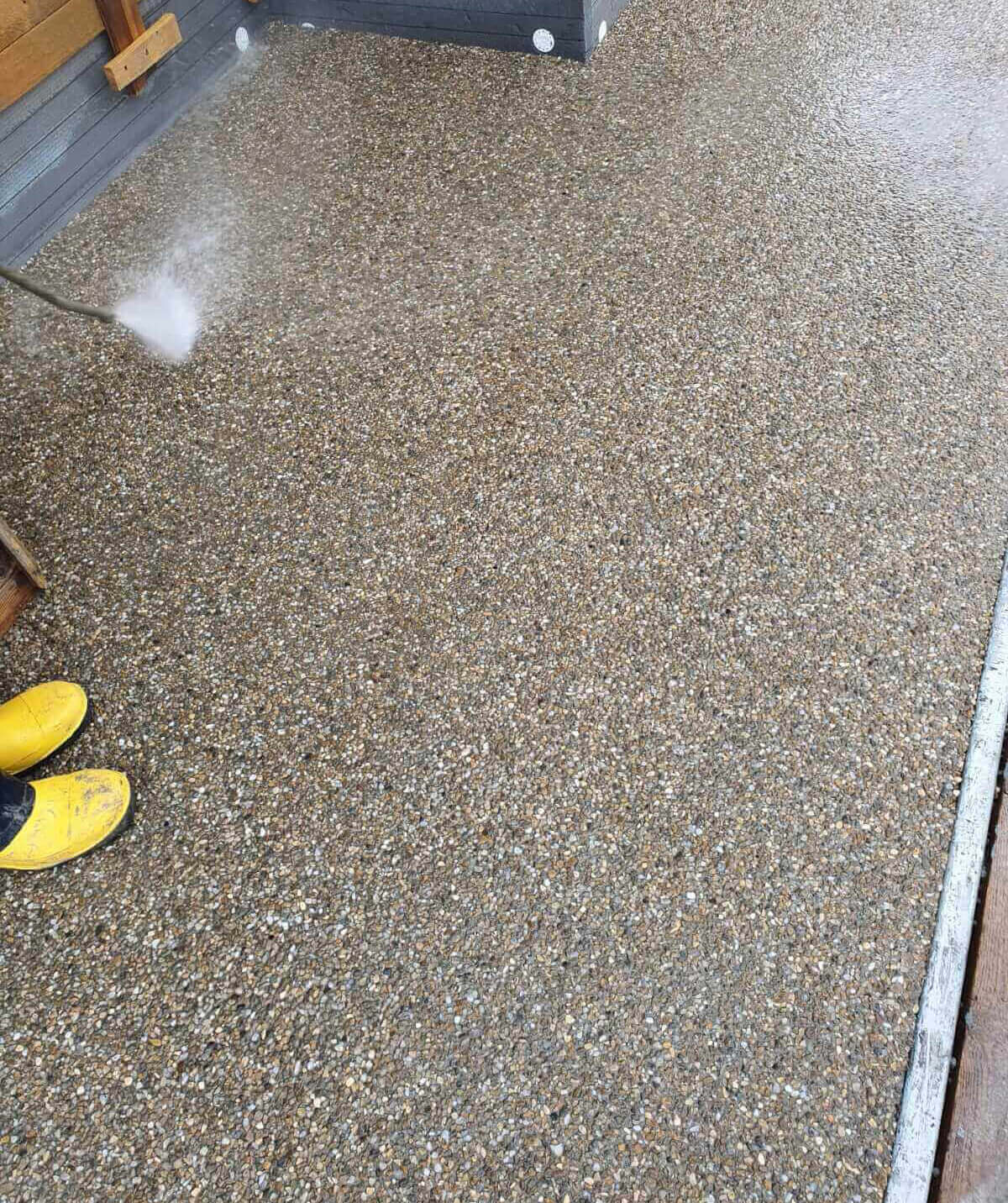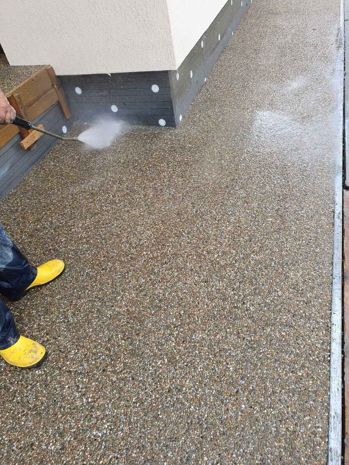 Acest pavaj se realizeaza din beton, peste care se aplica o solutie – prin pulverizare pe intreaga suprafata a betonului proaspat intins – ce nu permite uscarea, in strat superficial, a betonului. Aceast strat este inlaturat ulterior prin spalare cu apa sub presiune, ramanand ca textura a pavajului creat insusi piatra din masa betonului …. de unde si numele de pavaj din beton cu piatra spalata.